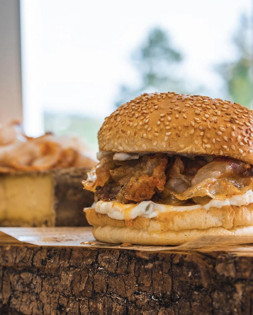 Un burger généreux avec un steak haché de bœuf, une tranche de reblochon fondant, des oignons caramélisés, et une sauce moutarde à l’ancienne, le tout dans un pain moelleux. Un délice montagnard !